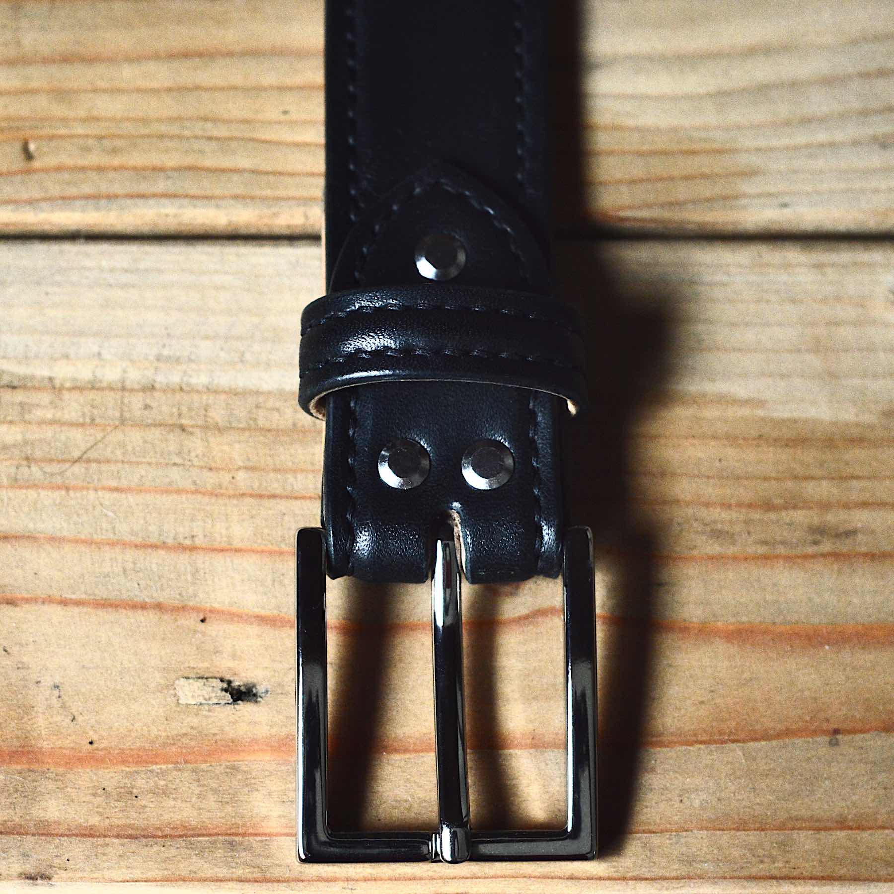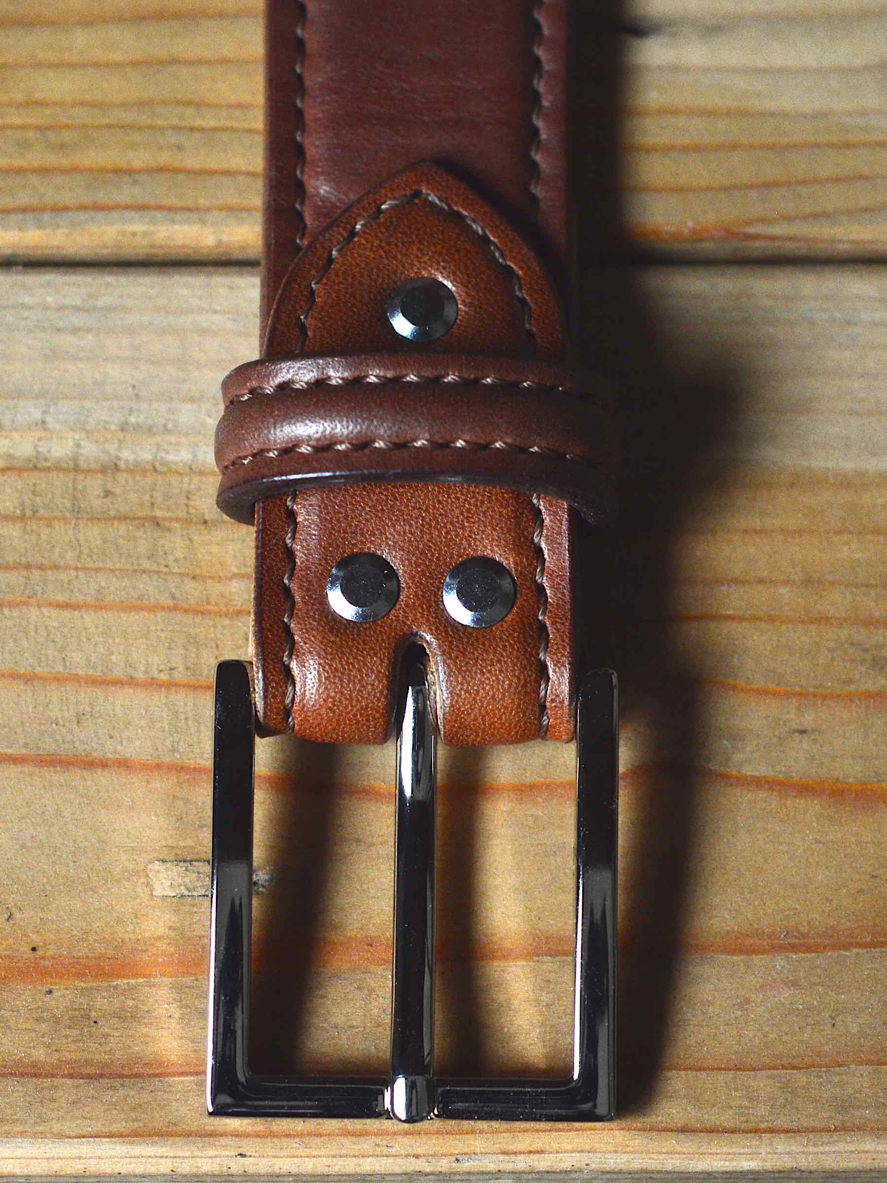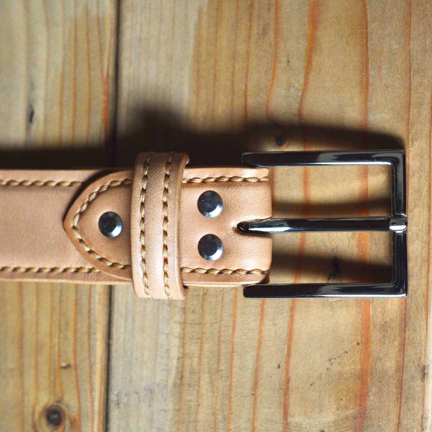 You may have seen many formal belts that have no stitching along the edges. These belts will often, over less than a year, feature a catastrophic failure. The layers simply come apart. We don't want that happening to you. We hand stitch (saddle stitch) along one direction. Then back stitch a few stitches, for good measure. There is no question of our thread breaking or a stitch coming loose.